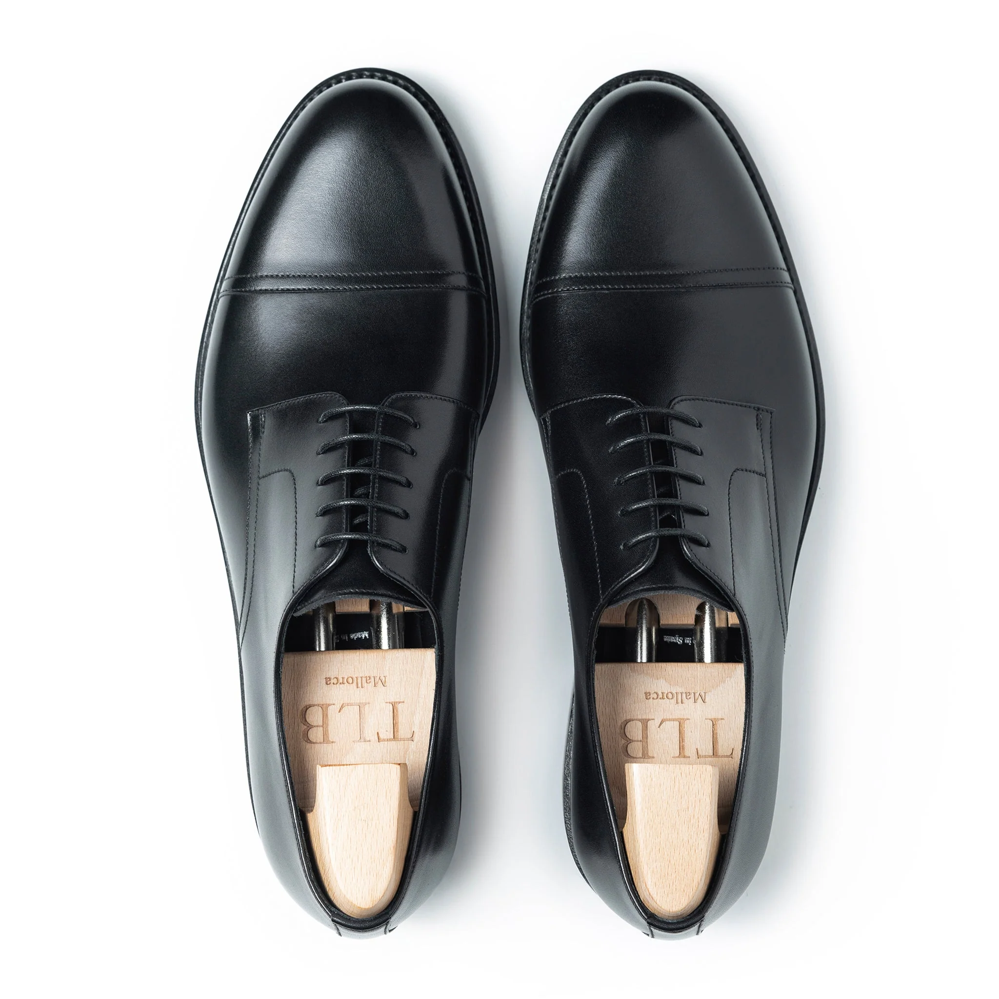 Straight cap toe derby made in black boxcalf leather, calf lining with vegetable tanned leather insoles finished with VIBRAM rubber sole.