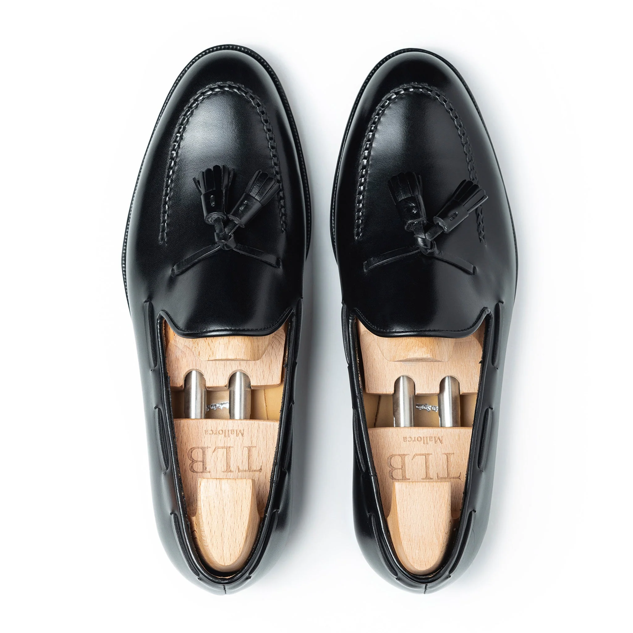 A tassel Loafer model featuring a beautifully handsewn made with Boxcalf leather in Black color. Using calf lining with vegetable tanned leather insoles finished with single leather closed channel sole to get more elegant finishing.
