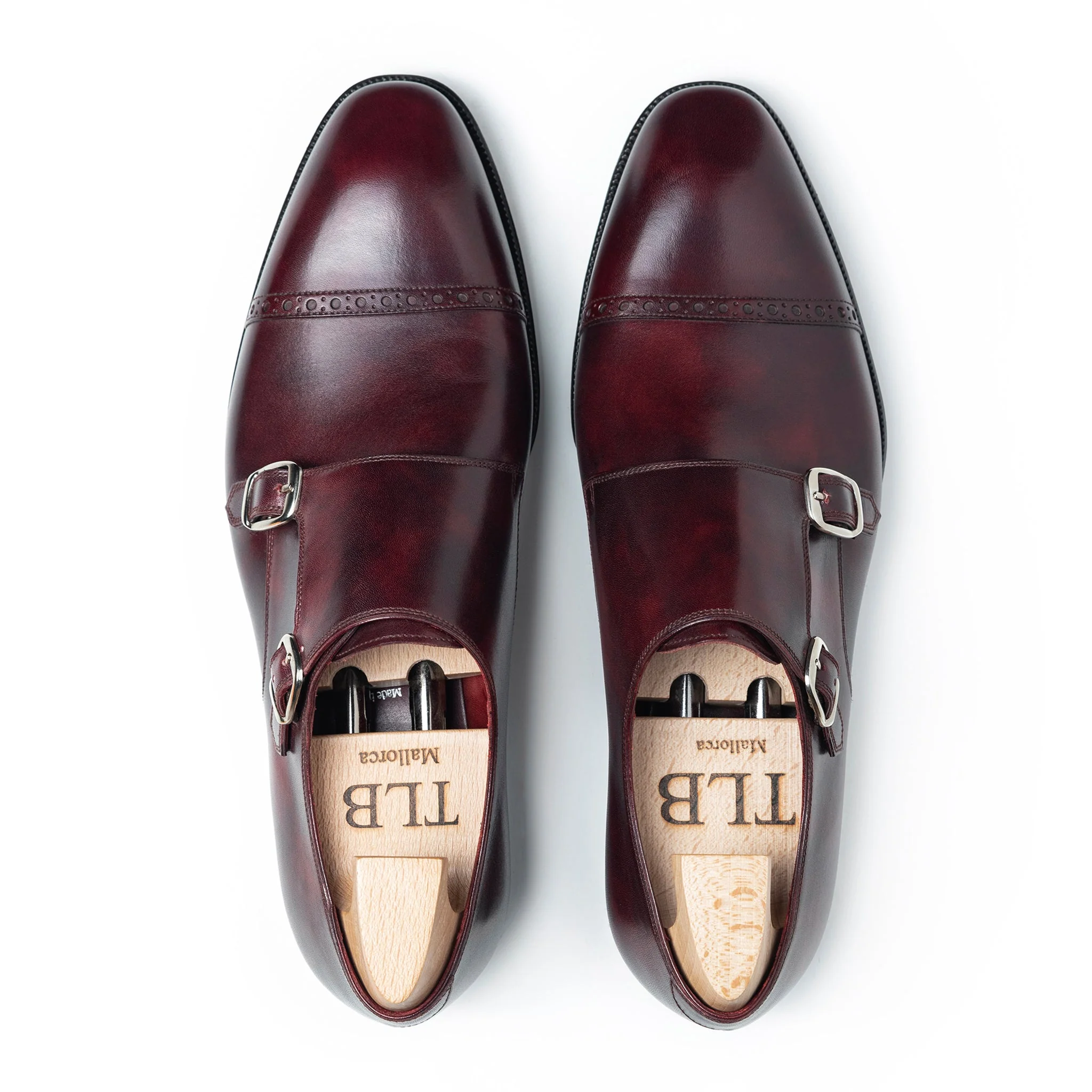 Double monk with punched cap toe made with Museum Calf leather in Burgundy color. Using calf lining with vegetable tanned leather insoles finished with single leather closed channel sole to get more elegant finishing.
