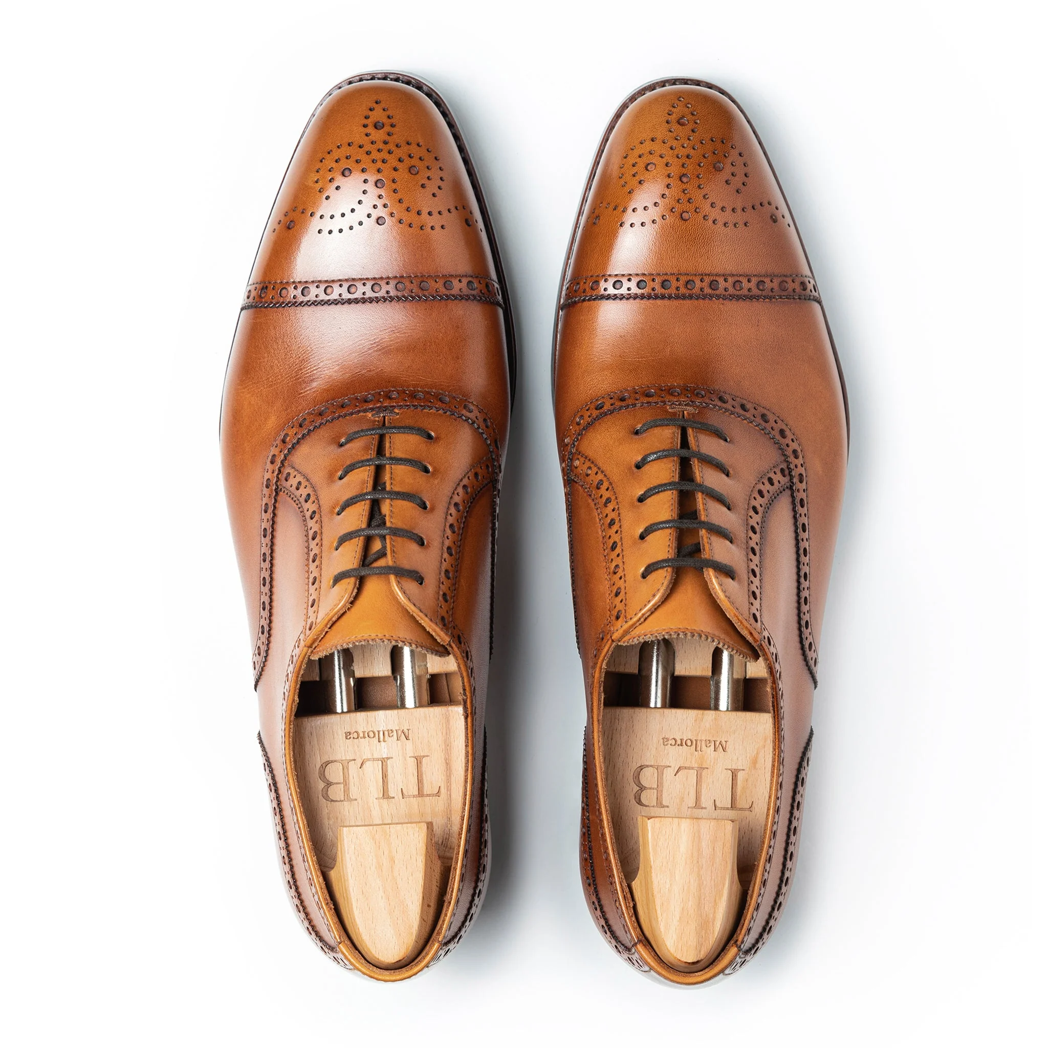Semi Brogue Oxford made in Vegano Leather using French Calf from Anonnay tannery in cuero color, calf lining with vegetable tanned leather insoles finished with single leather closed channel sole to get more elegant finishing.